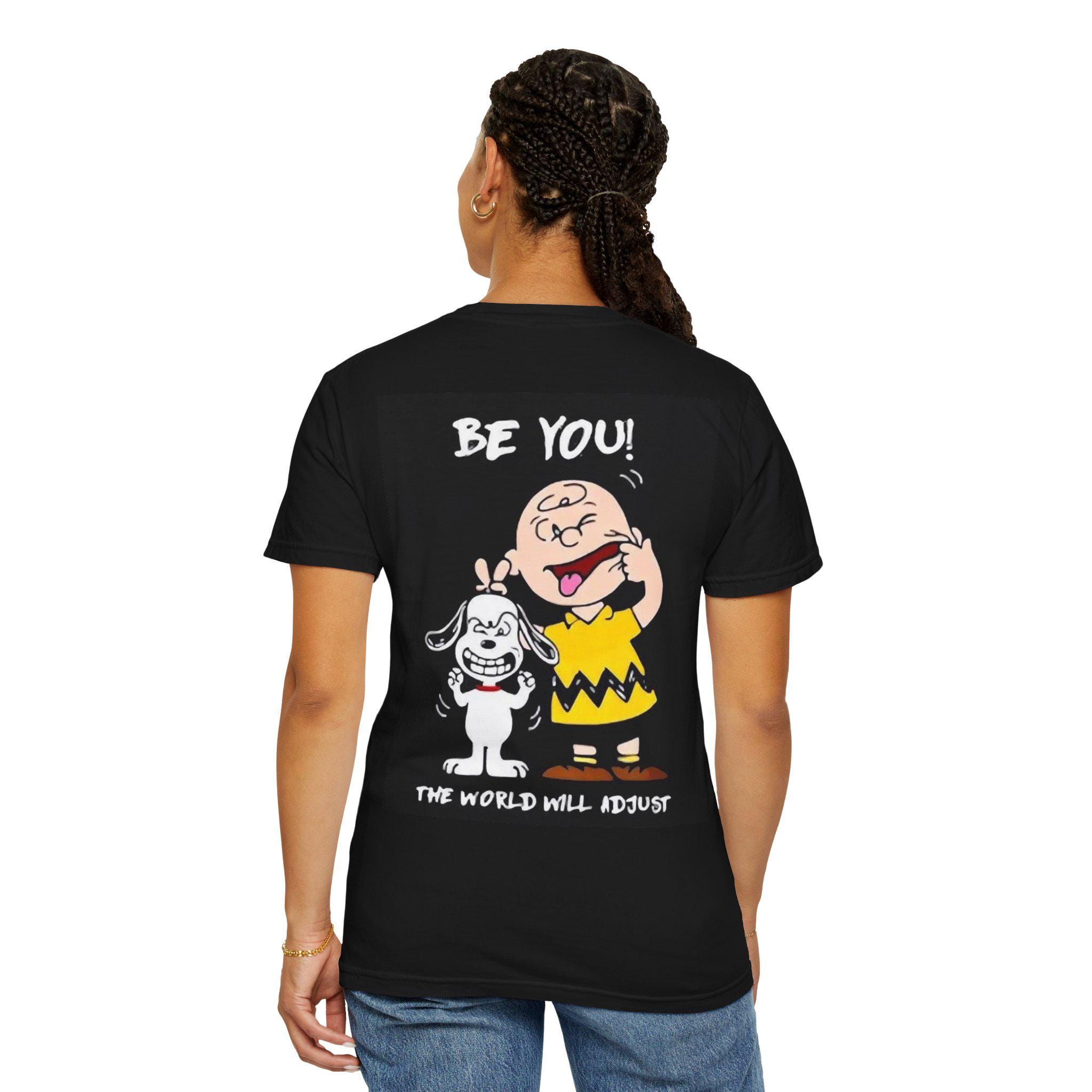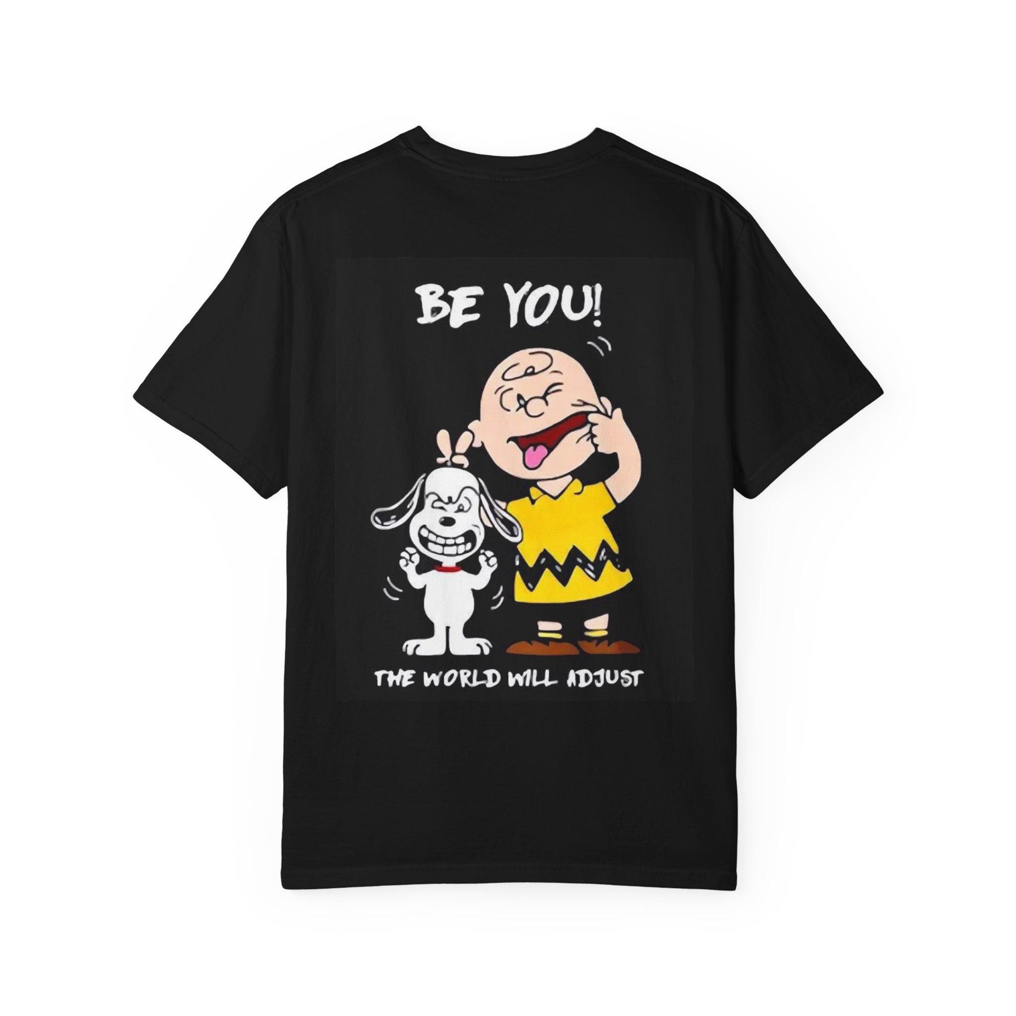 This Peanuts Snoopy & Charlie Brown Be You relaxed-fit garment-dyed tee brings soft, worn-in comfort and playful vintage energy to your everyday wardrobe. The heavyweight 100% ring-spun cotton feels substantial but broken-in from the first wear, while the post-construction dye gives each shirt a unique, lived-in hue. Bold, graphic front and back artwork captures a nostalgic cartoon vibe that reads like a page from a favorite comic strip — something you reach for when you want casual confidence and a bit of humor in your day. Wear it to weekends at the coffee shop, low-key meetups, or whenever you want a familiar, comfortable layer that still makes a statement.