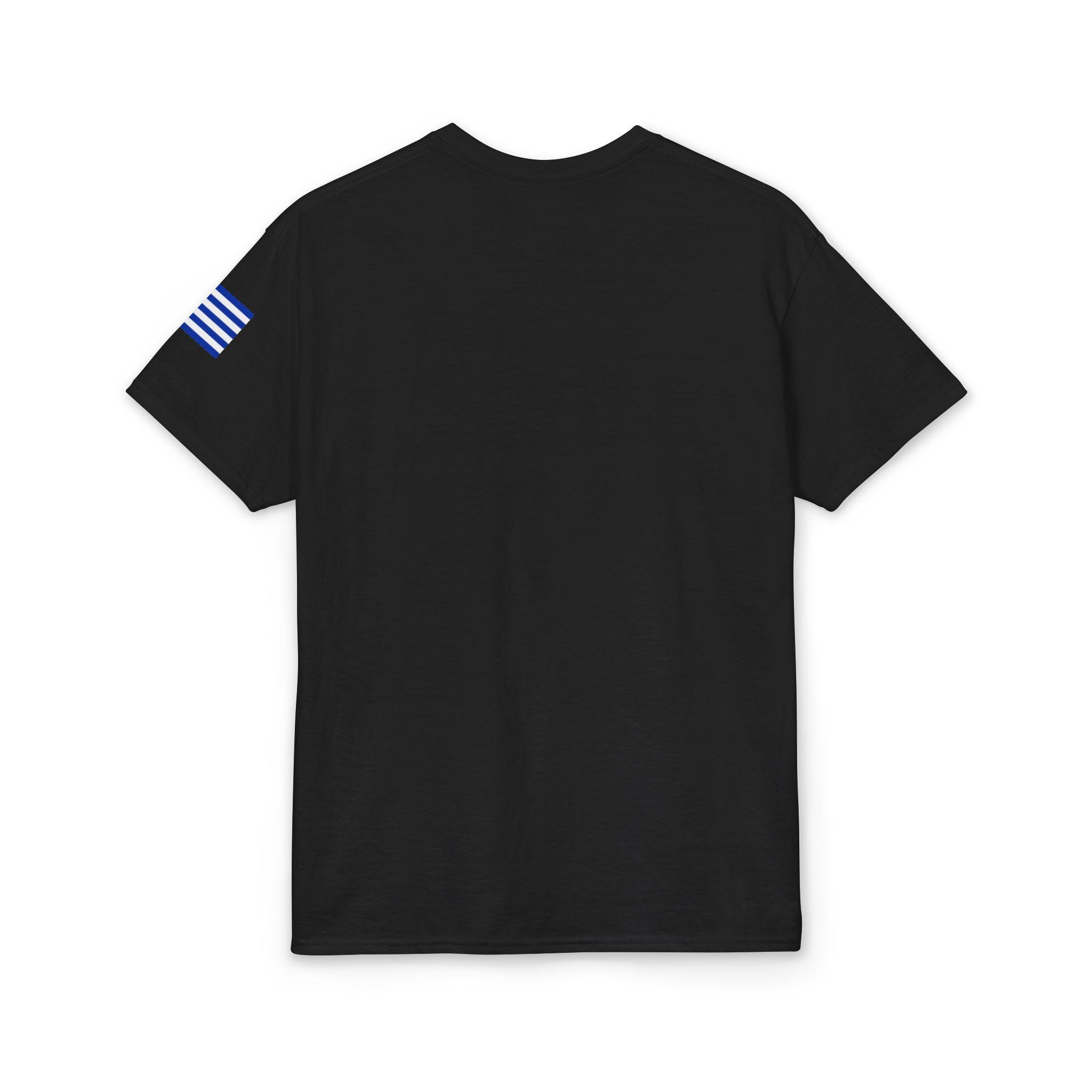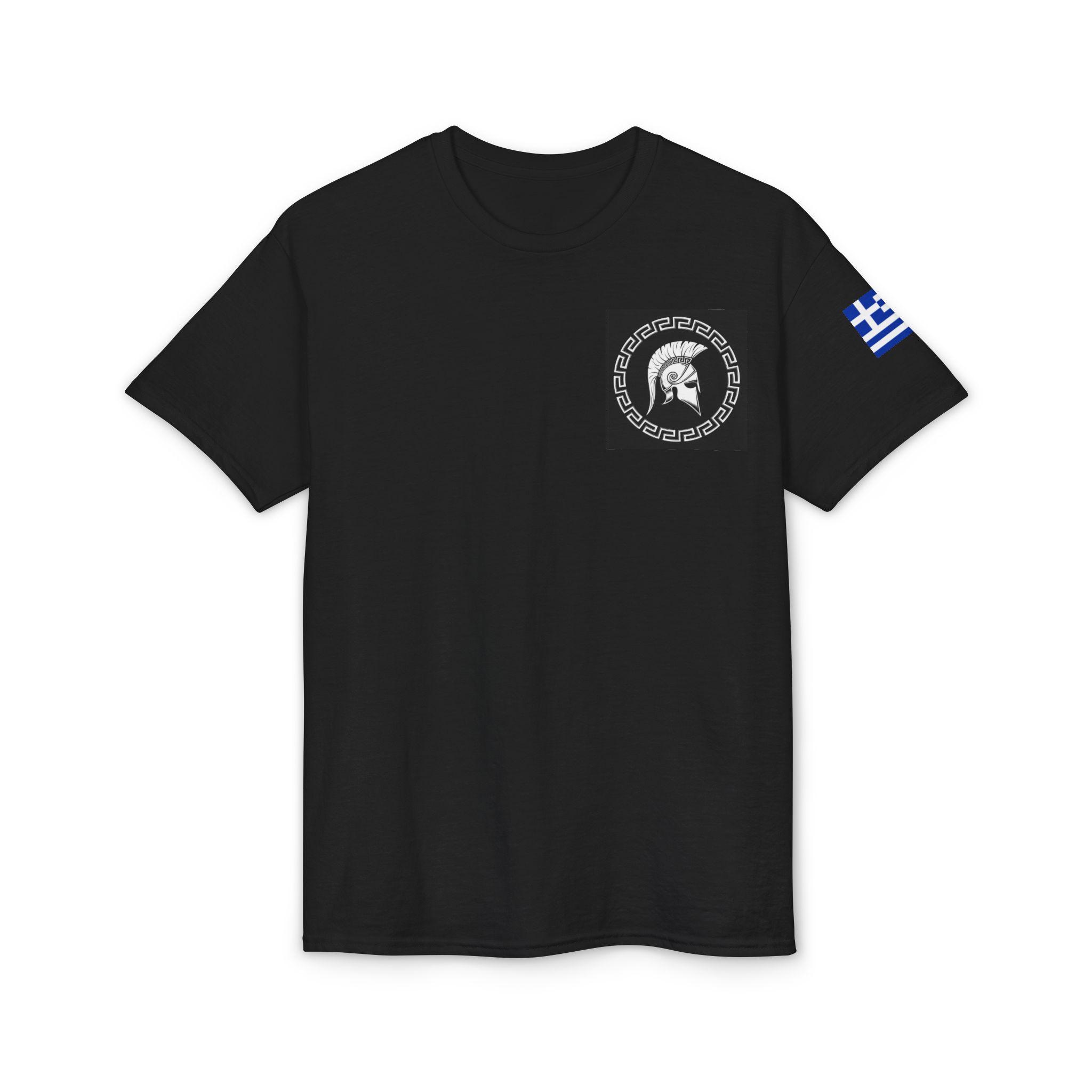 A compact, sturdy tee that wears like a lived-in favorite from day one. The design quietly nods to classic Greek iconography — a Spartan helmet set inside a meander border on the chest pocket area, with a small Greek flag on the sleeve — so it reads as both heritage and statement. The midweight DryBlend fabric breathes and pulls sweat away during warm days or active use, while the ribbed collar and taped shoulders keep the silhouette looking sharp after repeated washes. It sits naturally in casual wardrobes: layered under a jacket for city strolls or worn solo on warm afternoons at cafes, rallies, or cultural gatherings. This shirt fits someone who cares about history and identity, prefers clean, minimal graphics, and wants durable, comfortable everyday wear that carries meaning without shouting for attention.
